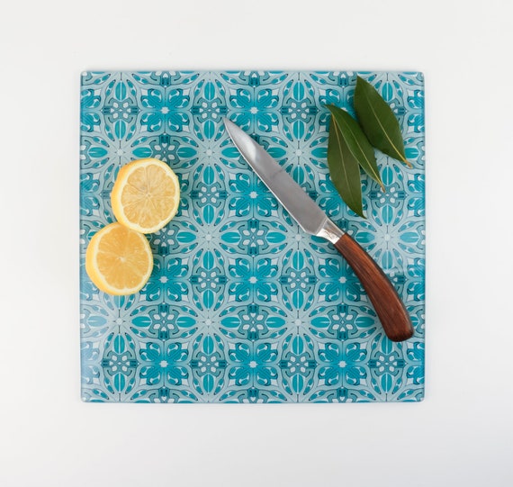Pretty Art Deco Worktop Protector Grey Blue Decor Large Chopping Board Heatproof Glass Trivet Large Serving Platter Retro Cheese Board